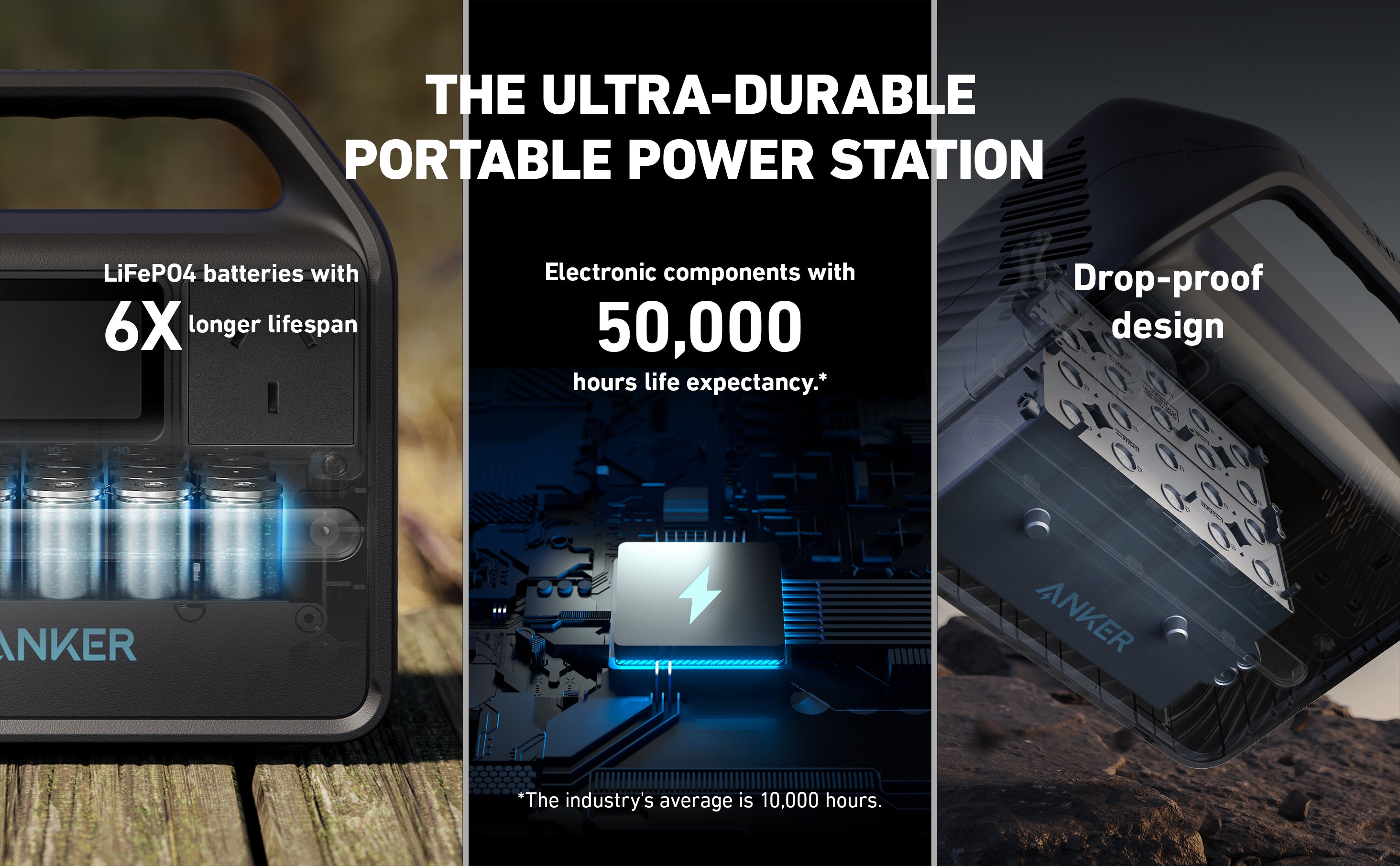 Lithium iron phosphate (LiFePO4) batteries have a 6 times longer lifespan and can last 3000 cycles compared to the average battery of other portable power stations.