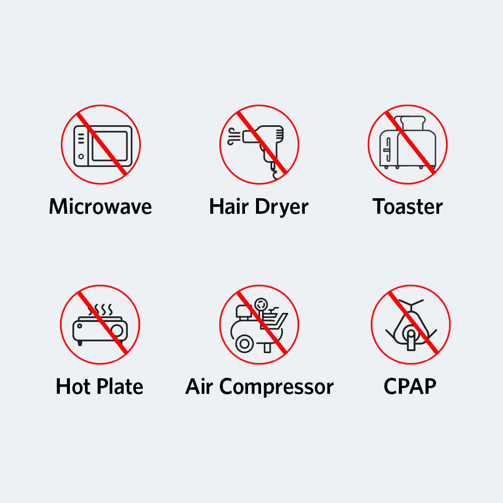 - Incompatible with appliances that require more than 200W input such as microwave, electric grill, refrigerator, electric vehicle, air compressor and more.